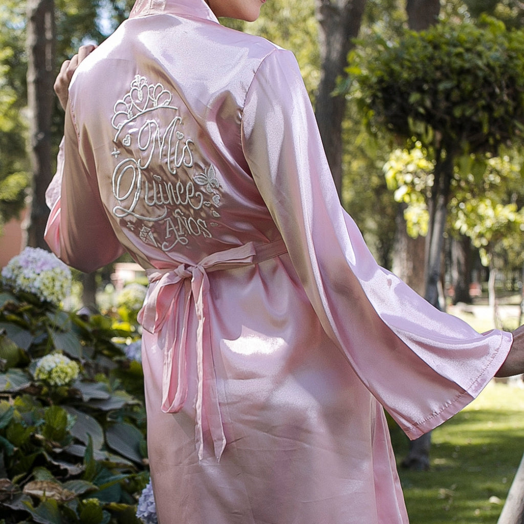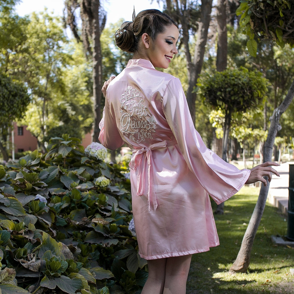 Uso: Ideal para los momentos previos a la celebración de quince años, durante la preparación de maquillaje y peinado, o como prenda de recuerdo conmemorativo.