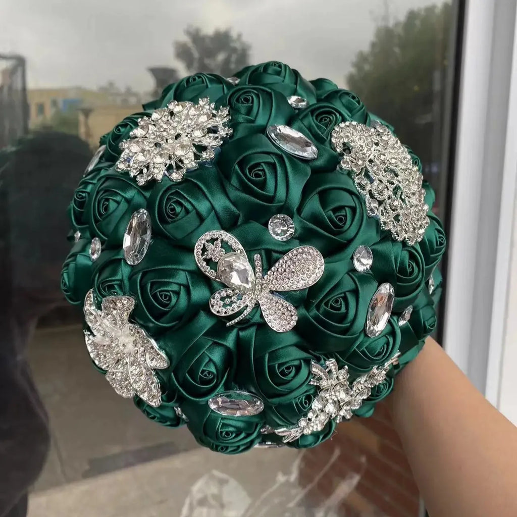 Material: Listón satinado, broches con pedrería, piedras acrílicas o de vidrio, base de espuma, tela rígida, cinta de satén para el mango.