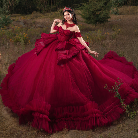 Marca: FIANCEE QUINCEAÑERA Imágenes reales: Sí Escote: Corazón Cola: Incluye falda CON COLA GRANDE.Talla: S-MColor: Burgundy/BorgoñaSujetador incorporado: Personalizado Decoración: Apliques, Cristales Accesorios: Mangas desmontables; tul pomposo.Personalizar: SI / Puede hacerse a medida Personalizar: SÍ / Puede hacerse a medida / Puede agregar forro / Puede...