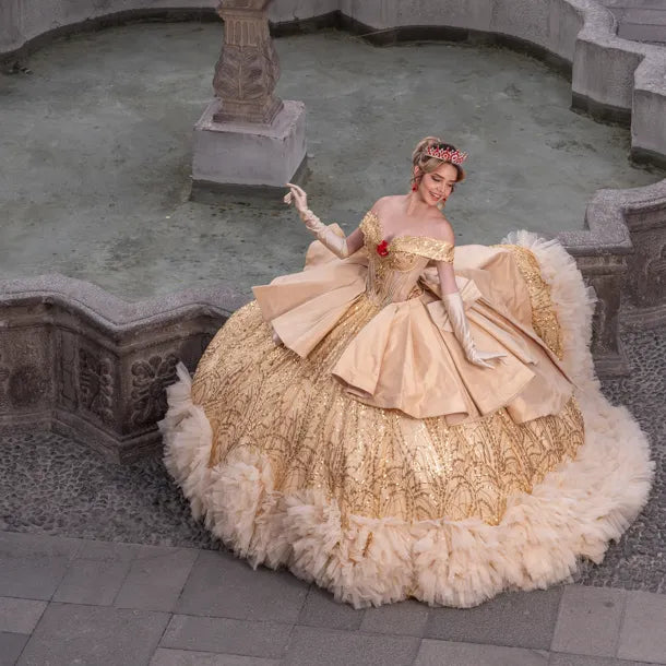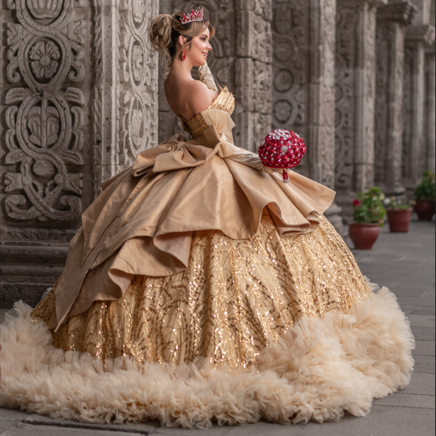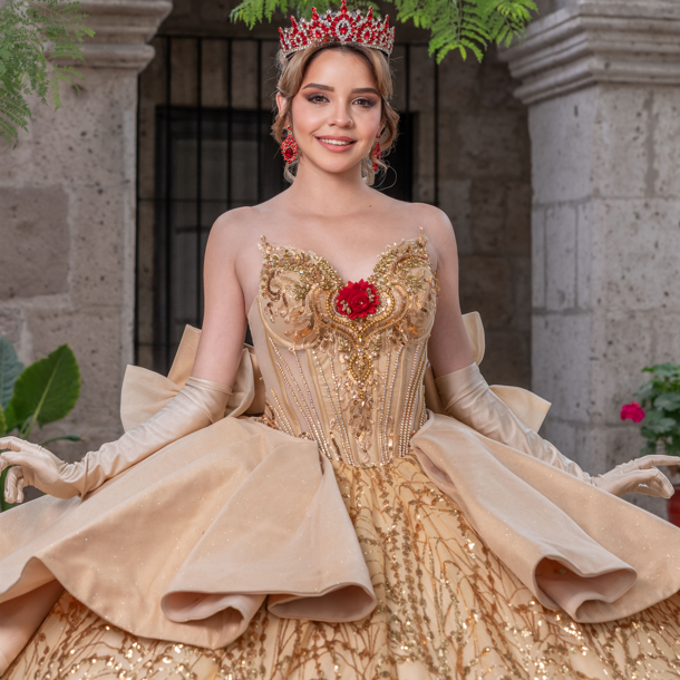 Decoración: Bordados artesanales, cristales, perlas y detalles florales en tono oro