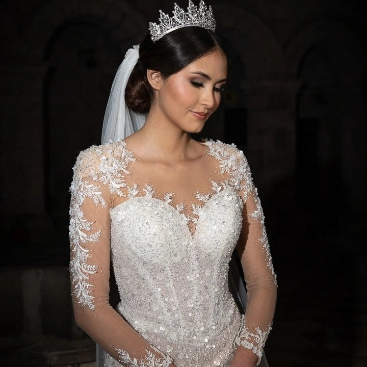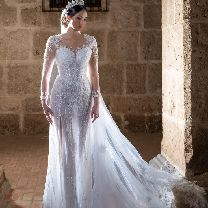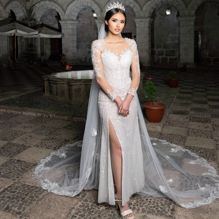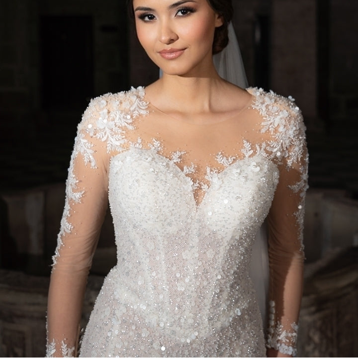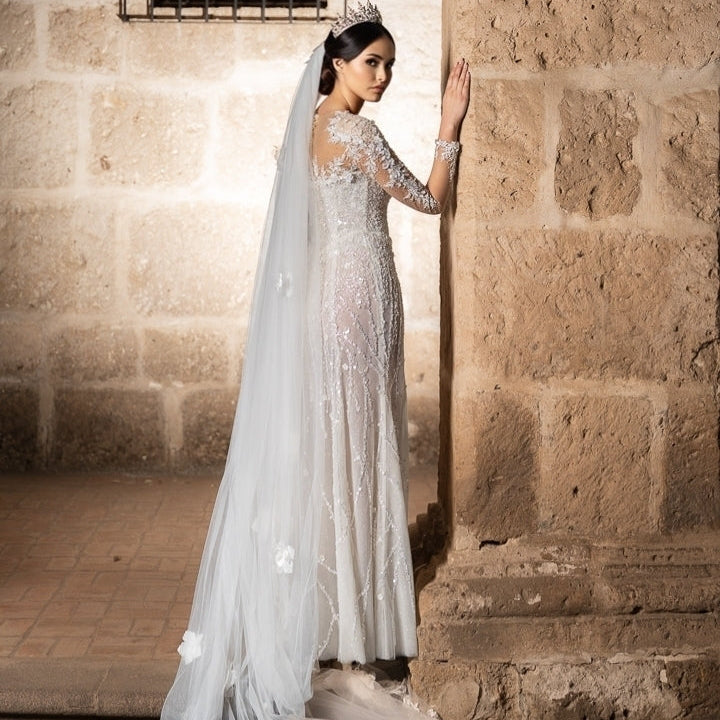 Mangas: Largas en tul ilusión con apliques bordados y acabado en puños florales.