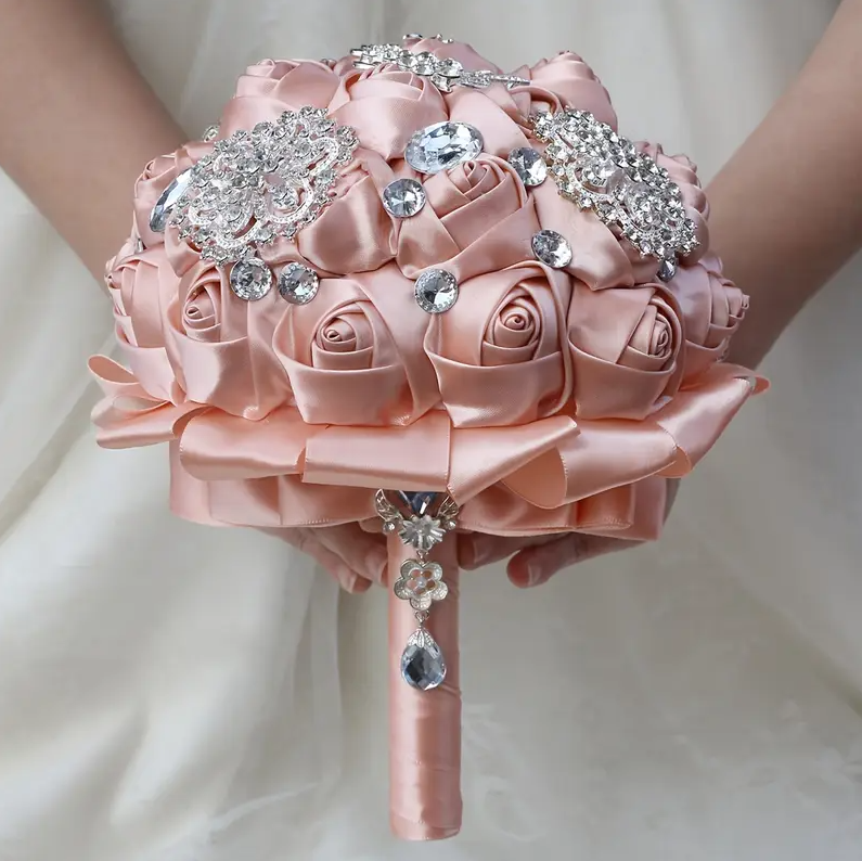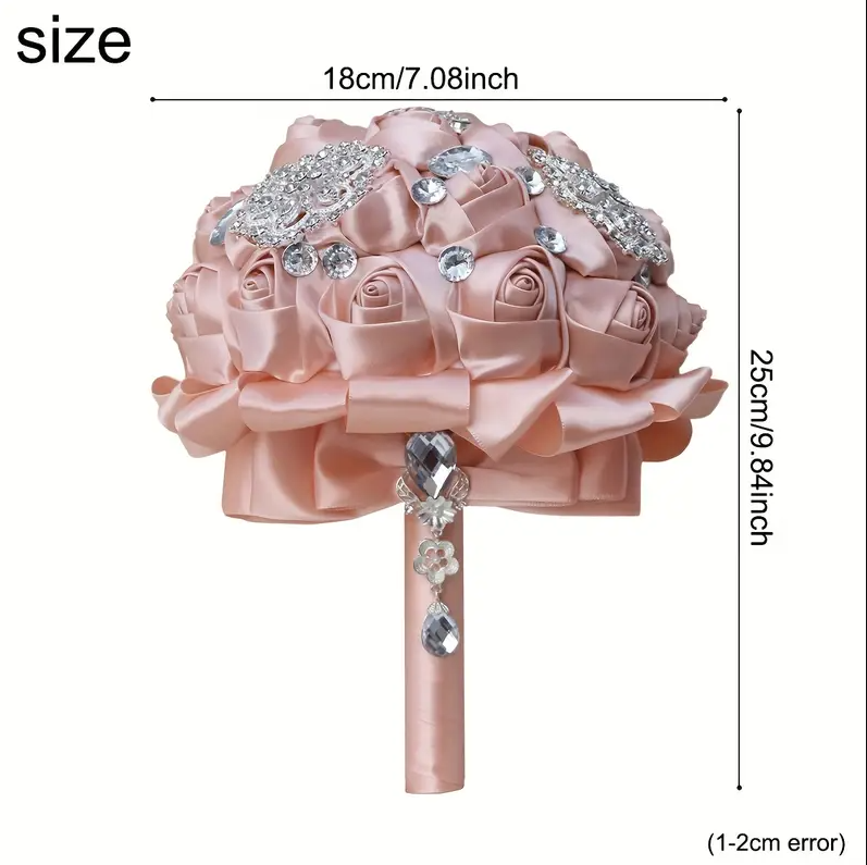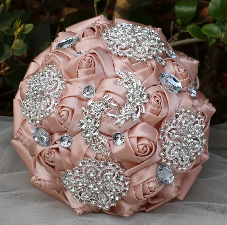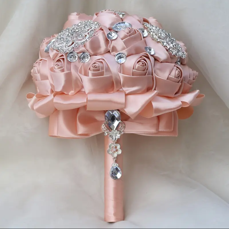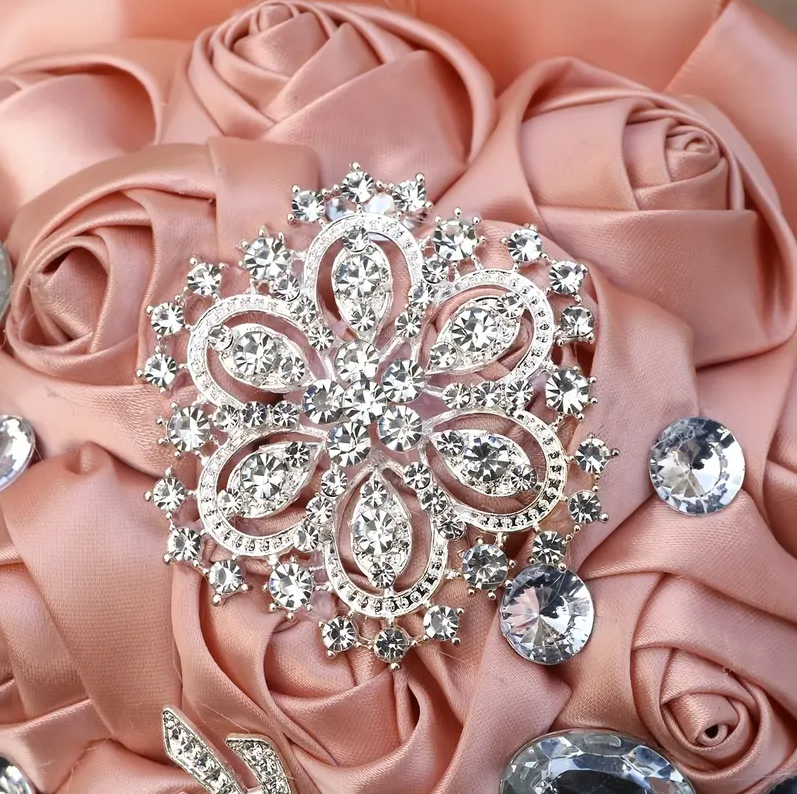 Material: Listón satinado, broches con pedrería, piedras acrílicas o de vidrio, base de espuma o tela rígida, cinta de satén para el mango.